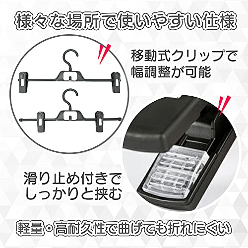 スカートハンガー の2つのクリップは左右に移動が可能なので、掛けたい物のサイズに合わせて調整できます。クリップ部分は強力な挟む力で衣類をがっちり固定し、緩みや滑り落ちを防止します。先端部分に施された滑り止めにより、衣類を傷つけたり跡を残さないのも嬉しいポイントです。