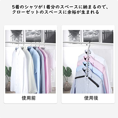 【 省スペースハンガー】 このシャツハンガー5着のシャツが1着分のスペースに納まるので、クローゼットのスペースに余裕が生まれます。クローゼット内のカテゴリ分けに