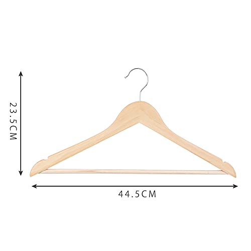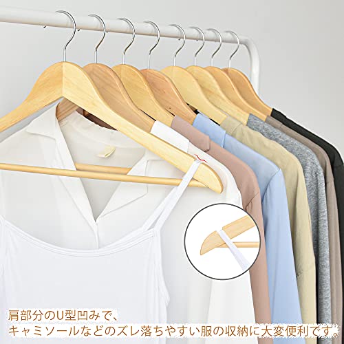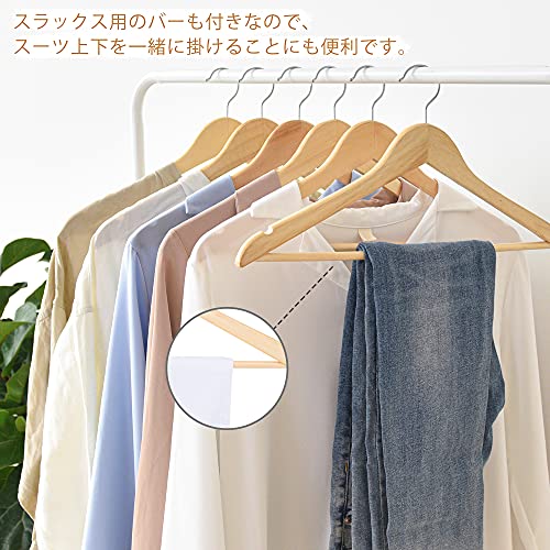 【スタンダードな木製ハンガー】天然木を採用し、木材特有の温もりはお気に入りの服を大切に保管できます。バーも付きなので、スーツ上下を一緒に掛けることなど多用途にご使用いただけます。肩部分の滑り止めU型凹みでキャミソールやスカートを掛ける時に滑りにくいです。