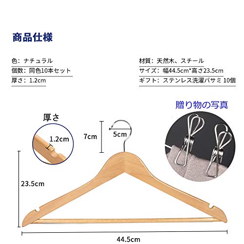 ハンガー色の種類:ナチュラル。おしゃれ且つ優雅、静電気が起きにくい木製ハンガーです。自然ままの色合いは、落ち着きの味わいを引き出し、シンプルなデザインでおしゃれなインテリアにも馴染みます。ギフト:ステンレス洗濯バサミ 10個