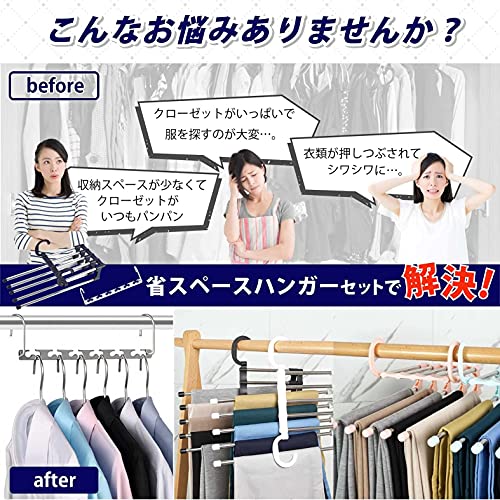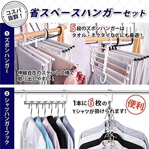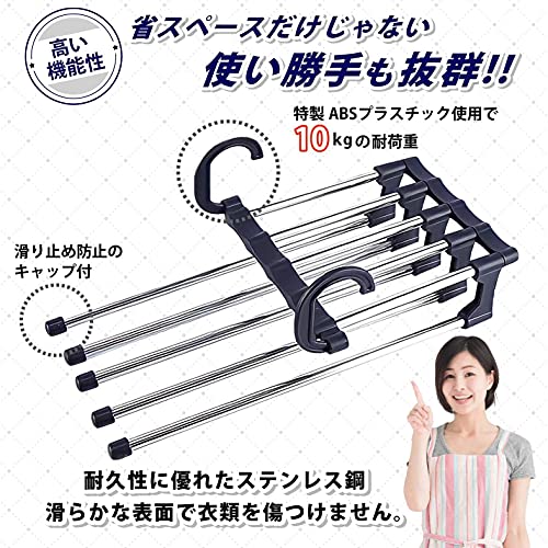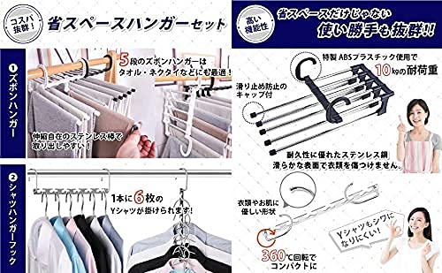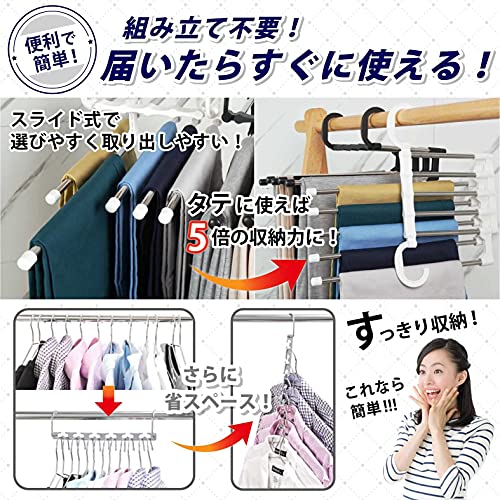 【省スペース】5段のズボンハンガーは、クローゼットスペースを大きく省き、5倍の収納力を発揮します。簡単に開閉することができ、ズボンがシワになる心配もなく、すっきり収納できます。またシャツハンガー掛けとセットになっているのでTシャツやYシャツの収納スペースも省スペースで掛けられよりクローゼットがすっきりに。