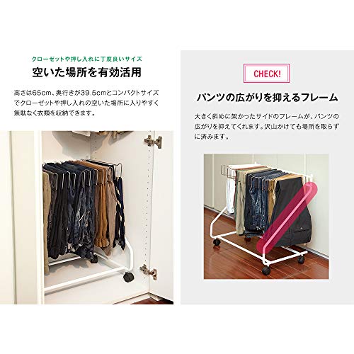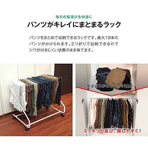 ?【パンツがキレイにまとまるラック】 パンツをまとめて収納できるラックです。最大19本のパンツがかけられます。2つ折りで収納できるのでシワが付きにくい状態のまま保てます。 ?【掛けるだけの簡単収納】 ラックに掛けていくだけで、どこにどのパンツがあるかが見やすい並びに。ひと目でお探しの1本を見つけられます。