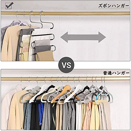 【省スペースで服が滑らないハンガー】ズボンハンガーはわずか0.5cmの薄さで、省スペースが叶います。薄いですが1本で8kgもの重さに耐えるられます。5連S型ズボンハンガーを利用し、散らかったクローゼットがスッキリになり、ズボンの探しも簡単になります。