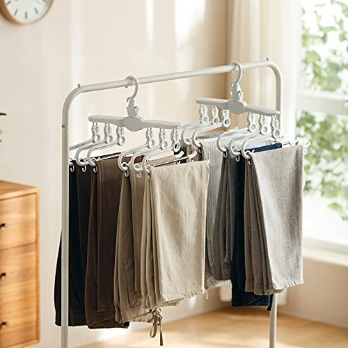 【素敵なデザイン】普通のプラスチックズボンハンガーより、当製品の素晴らしいところは以下通りです。まずは当製品は折りたたみ可能です。クローゼットや押入れの空間を大幅に節約します。同じスペースでより多くな衣類を収納できます。超省スペースです。次は当製品は360度回転できます。ズボンを掛けることも取り出すことも便利です。更に毎段の掛け竿にクリップようなバックルがあります。安定性が高くてズボンが落とすことを心配いらないです。