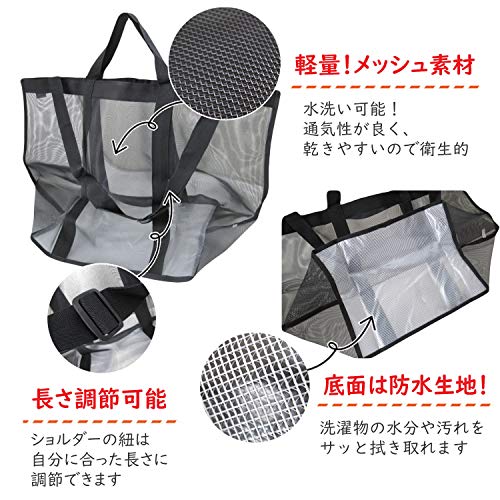 軽量メッシュ素材:通気性が良く、乾きやすいので衛生的。 長さ調節可能:ショルダーの紐は自分に合った長さに調節できます。 底面は防水生地!:洗濯物の水分や汚れをサッと拭き取れます。