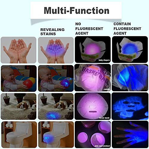 【家庭必要なアイテム】毎日のトイレ掃除では見えないカビや菌などのよごれを発見、衣料品の蛍光剤・増白剤等の残留確認とホテルの部屋の検査用途もできます。また、化粧品やパックに体害のある蛍光剤、蛍光染色等の蛍光反応確認もできます。犬や猫を飼っているとたまにやってしうまう絨毯でのおトイレです。おしっこしたと思われる場所にすぐに光をあてれば発見する事ができます。その他にも使用用途満載!
