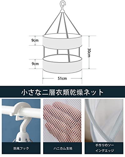 【使用し易かった】防風デザインの付きし易いフックと2箇所の幅広い滑り止め付いております。メッシュ素材なので、乾きにくい衣類でも心配する必要がありません。2段平干しネットで一気に干せますから。