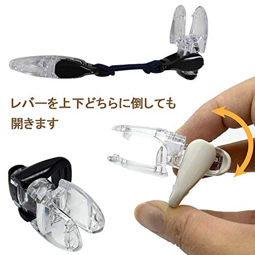 クリップのレバーを上または下に倒して開閉するタイプです。クリップは両端各1個の仕様。ゴムを使用しているため、ずれてもやや融通がきき、クリップがはずれにくくなっています。