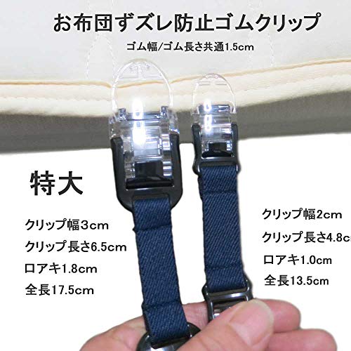 ゴム、クリップ、縫製まで、すべて日本製のお布団クリップ2個組です。特大クリップなのでがっちりと留められ、お布団や毛布のずれを防止します。