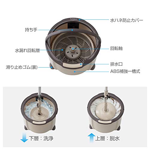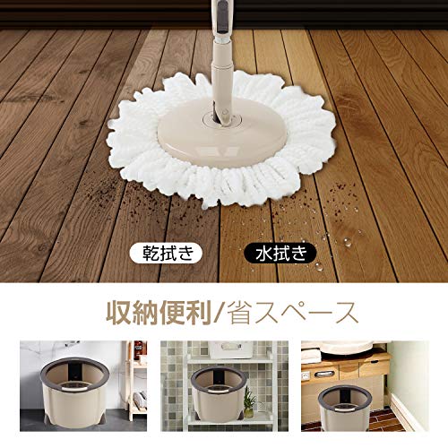 【一槽式仕様】:一槽式のデザインで、従来の二槽式回転モップより、更に掃除の負担を軽減します。持ち手も付きで、掃除時の移動は、より簡単且つ楽に行います。洗濯時、より少量の水でモップの洗浄ができまして、水の節約ができます。バケツの空間を有効的に利用できて、環境的にもいいです。 【洗浄・脱水半自動化】:構造的に、昇降回転式洗浄や脱水機能付きで、適当に清水を