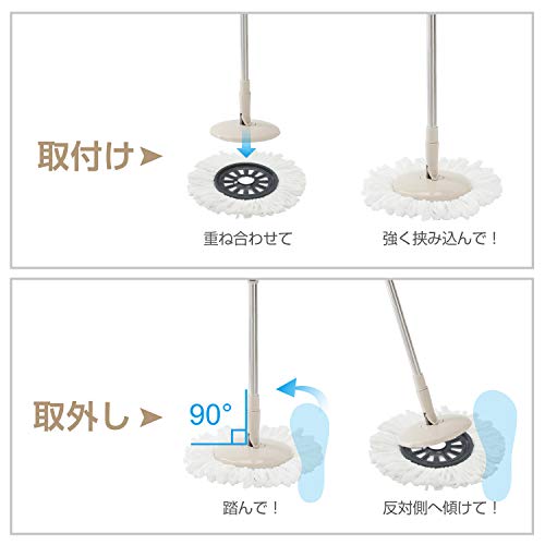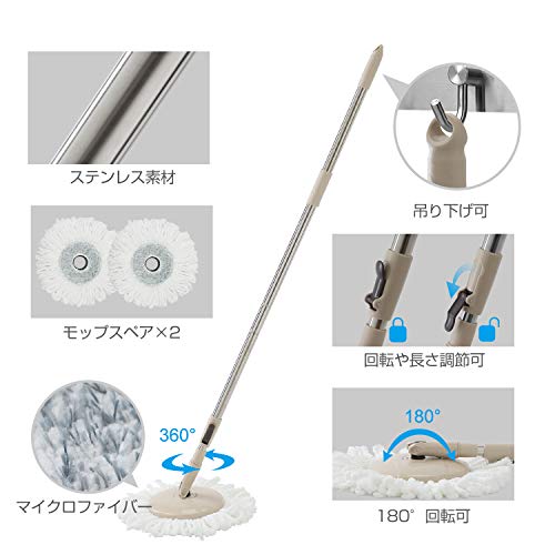 【基本情報】:「カラー」:ベージュ;「内容」:モップ本体×1、バケツ×1、モップのスペア×2、日本語/英語取扱説明書×1;「素材」:ステンレス+ABS+マイクロファイバー等。「商品サイズ」:1.パイプ長さ:130cm;2.モップベース直径:16cm;3.バケツ:直径:31cm;高さ:24cm;「重さ」:約2.05kg。「包装サイズ」:約30x30x25cm。