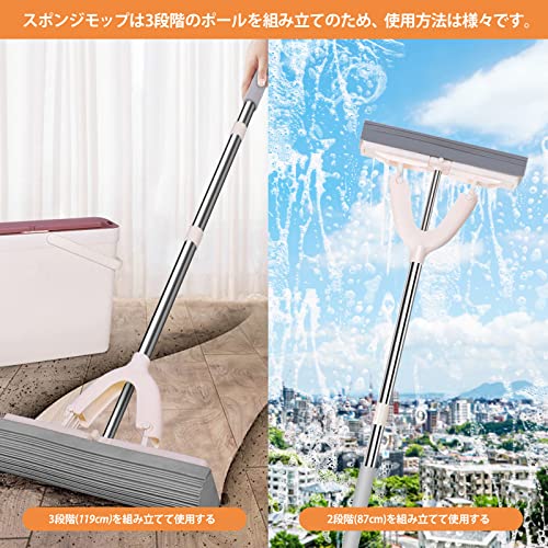 【使用方法や場所等色々】スポンジモップは3段階のポールを組み立てのため、使用方法は様々です。2段階(87cm)を組み立てて使用すると、窓等カラス面に結露の場合に役に立ちます。3段階(115cm)を組み立てて使用すると、普段の床掃除や天井掃除の場合は幅広い使用しています。