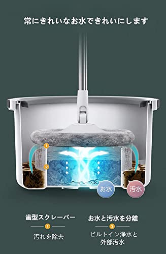「トルネード回転式」:a. 掃除の時は、バックルを閉まった状態で、ハンドルが360°回転可能、前後180°倒れますので、掃除の方向、高さや角度が自由に調整できます。b. 洗浄や脱水の時は、バックルを開けった状態で、モップ・ヘッドをバケツ内に置いて、上下押すだけでモップを速