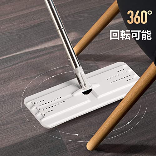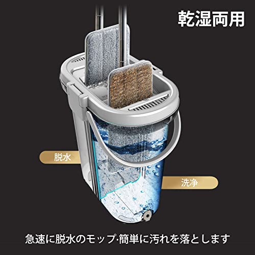 【手洗い不要乾湿両用モップ】モップは絞り器バケツ付き、洗浄を手で洗う必要がなく綺麗になれます。手洗い不要で腰を大変に曲げる必要なくお気軽に使用できます。360°回転ヘッドは隙間やコーナーなどの狭い空間に深く入れます。
