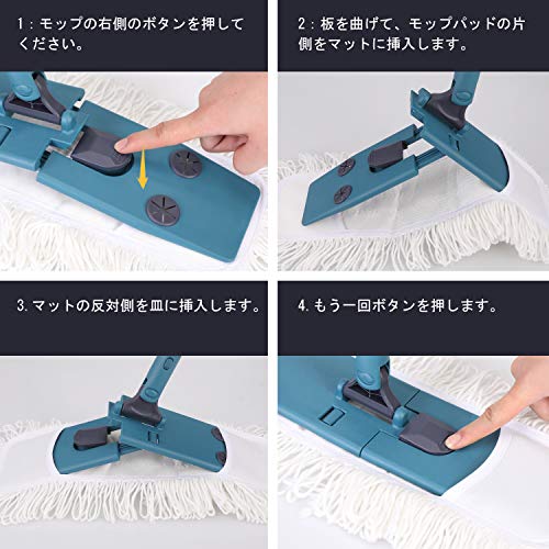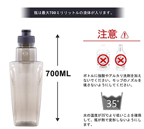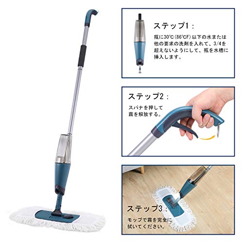 【扇形噴水&片手操作可能】電源・電池、バケツは不要。モップハンドルのハンドルにある水圧装置を介して、モップヘッドの水出口から液体が霧状に出るので、洗浄効率が大幅に改善される。手元のレバーを引くだけでボトル内の水が散布ができ、立ったまま、水拭き(雑巾がけ)が可能です。フローリングやタイル掃除がはかどる便利アイテムです。