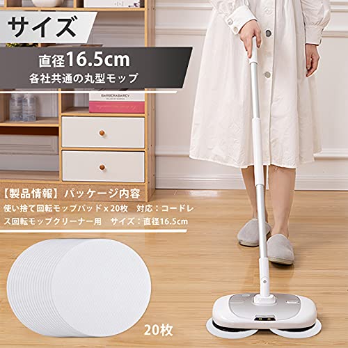 【製品情報】パッケージ内容:使い捨て回転モップパッドx20枚 対応:コードレス回転モップクリーナー用 サイズ:各社共通の直径16.5cmの丸型モップ 取り付け方法:他のツールがいらなく、電動モップのベルクロに直接取り付けるだけい