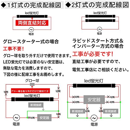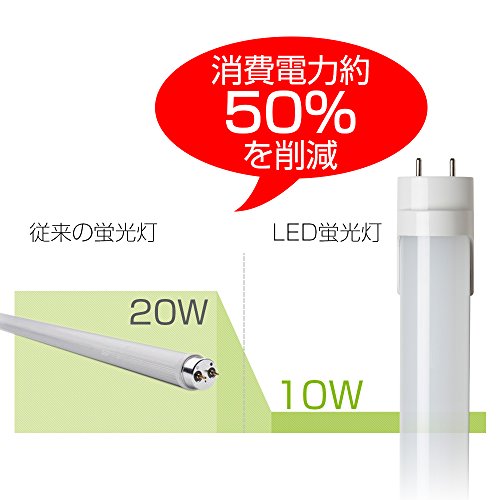 商品名:LED蛍光灯 直管20w形?消費電力:10W?口金:G13?全光束:1100lm?色温度:6500K(昼光色)?発光角度:180° (ご注意:お使いの器具が両側直結対応グロースターター式の場合は、グロー球を取り外すことが必要です。)
