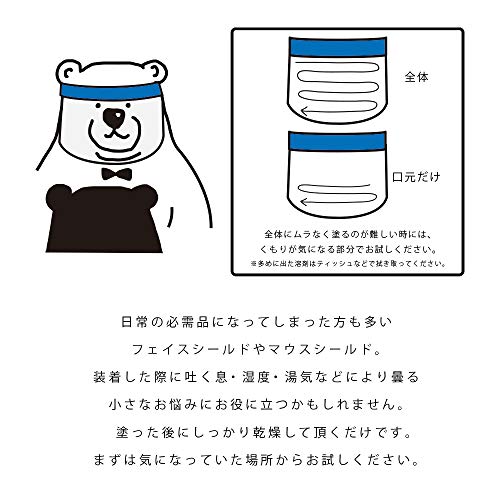 フェイスシールドやマウスシールド(マウスガード)に直接塗るタイプのくもり止めです。塗布後に水を掛けずに乾燥させるだけ。吐く息や湯気によりフェイスシールドが曇ることを抑制します。