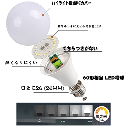LED調光器対応 e26調光器対応 LEDバルブ 昼光色 は無断階調光でき、調光範囲は100%~10%、様々な照明器具で使用できます。