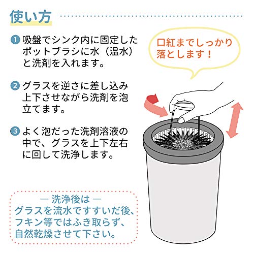 ブラシの底の吸盤で強力に吸着し、ゴシゴシ洗っても動きません。食洗器では落ちにくい口紅までしっかり落とします。