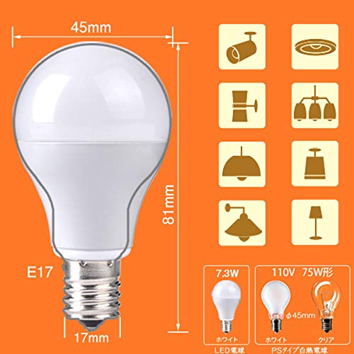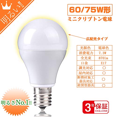 | 商品名 | E17 LED電球 調光対応 電球色 7.3W 870lm 75W形相当の小形電球タイプ・ミニクリプトン型LED電球 全方向タイプ(電球 |