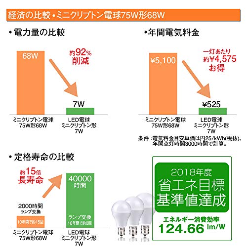 ?【業界トップクラスの明るさ(870ルーメン 60W~75W相当】この小形電球タイプ・ミ ニクリプトン型LED電球はエネルギー消費効率約124.66lm/Wを実現し、普通のミニクリプ トン電球75W形と比較して消費電力を約90%削減できます。