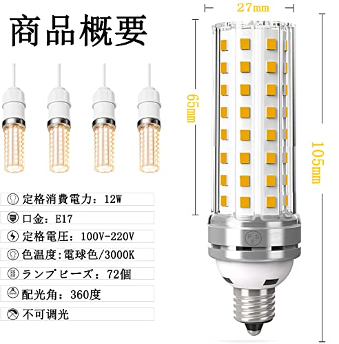 口金サイズ:E17、色温度:電球色 3000K、定格消費電力:12W、100W-110w形相当. 90%消費電力をカット! 電源:AC 100-240V(50/60Hz共用)、 サイズ:Φ27H105mm。全光束:1000-1100lm、ビーム角度:300°