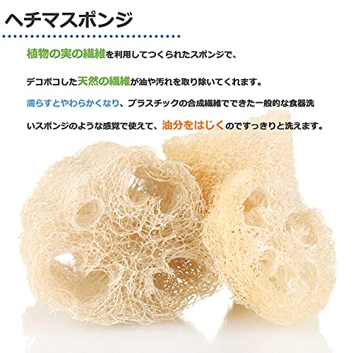 【ヘチマスポンジ】植物の実の繊維を利用してつくられたスポンジで、デコボコした天然の繊維が油や汚れを取り除いてくれます。濡らすとやわらかくなり、プラスチックの合成繊維でできた一般的な食器洗いスポンジのような感覚で使えて、油分をはじくのですっきりと洗えます。