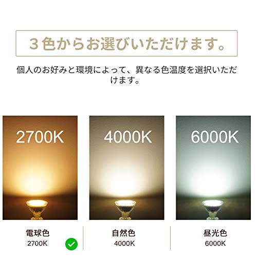 【商品仕様】口金:GU5.3、入力電圧:12V、ルーメン:500lm、省エネ:5W=50Wハロゲン電球の明るさ、色温度:2700k(電球色)、ビーム角度:120°。