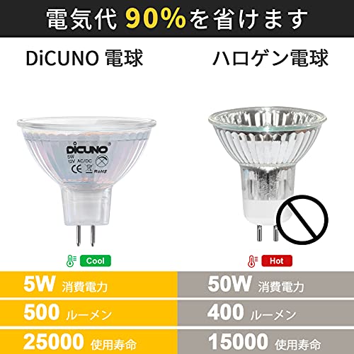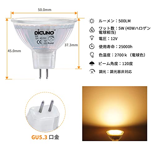DiCUNO MR16 12V LED電球 GU5.3口金 50W形ハロゲン相当(5W)電球色 2700k 高輝度500lm スポットライト 非調光 6個セット