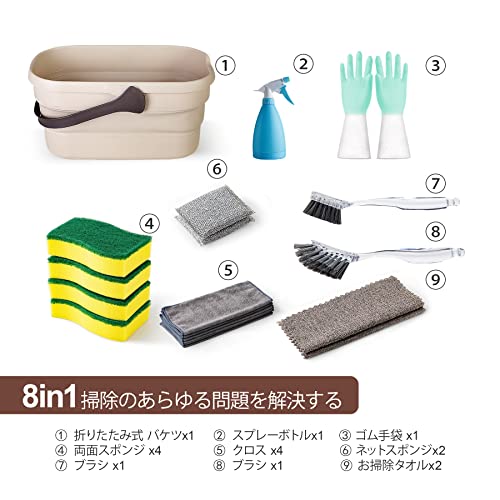 【セット詳細】:折りたたみ式 バケツ1 スプレーボトル1 ゴム手袋×1両面スポンジ4 クロス4 ネットスポンジ2 ブラシ1 ブラシ1 お掃除タオル2。