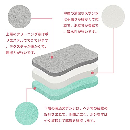 上質な使用感:私達のスポンジは摩擦力の強いドライクリーニング布と高密度スポンジから構成されています、嫌なにおいがなく、使用中に砕屑が落ちず、効率よく耐久性があります。スポンジはメッシュが細かいです、泡立ちがいい、汚れ取りが強い。底の大きなメッシュデザイン、水分をすばやく切ることができます、乾燥を保つ。