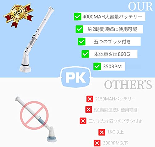 【4000mAh効率・ハイパワータイプ】:バスポリッシャー電動:大容量12V/4000mAhバッテリーを使用し、約4時間でフル充電し、1~2時間連続に使えます。元の2000mAhの基礎上さらにアップグレードされ、使用時間と清掃強度も強くなっています。