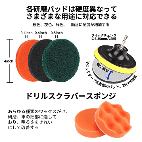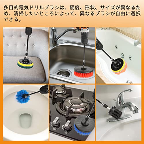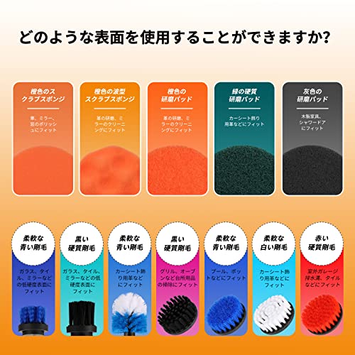 セット内容:フラットブラシx6、砲弾型ブラシx1、研磨パッドx12、スクラブスポンジx2、スクラブコネクターx1、延長ロッドx1(ご注意:セットには電動ドリルが含まれない)。