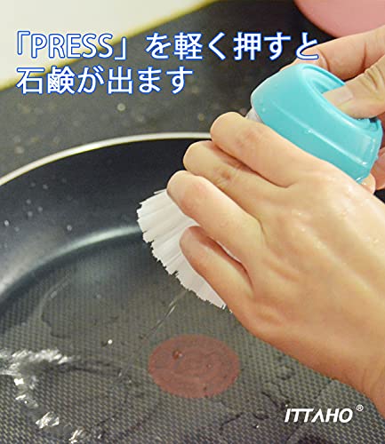 ITTAHO ソープ ディスペンシング パーム ブラシ: スクラバーは詰め替え可能なソープ ディスペンサーに取り付けられています。上部を押すと、食器用石鹸または洗剤が取り出され、掃除が始まります。食器、鍋、フライパン、調理器具、シンクの掃除だけでなく、自動車、車、エンジン、バイクの掃除にも使えます。すべての家族に 1 つのマルチユース クリーニング ブラシ。