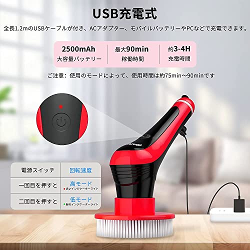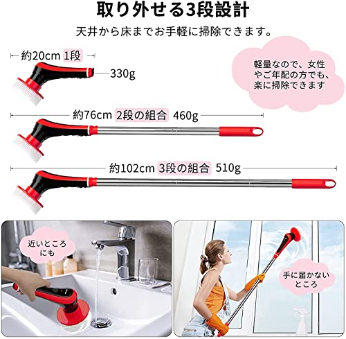 ?【取り外せる3段式設計&二つの回転速度モードのお風呂掃除ブラシ】この電動掃除ブラシは回転速度300RPMと200RPMの二つのモードを搭載します。電動バスポリッシャーの回転スピードは高速で力を入れずに汚れを徹底的に拭き取ります。水の飛散を防止して掃除の時間が短縮と効率的になります。浴室掃除用ブラシが取り外せる3段設計( 1段の長さ約20cm、2段組合わせた長さ約76cm、3段組合わせた長さ約102cm )により、清掃距離によって、延長ハンドルの取り付け、取り外しを通して、長さを自由に調節できます。腰をかがめず、浴槽から天井までのお掃除を軽々届きます。水の飛散を防止して掃除の時間が短縮と効率的になります。日常お風呂上がりの掃除、引越し前の掃除、年末の掃除など全部満足できま