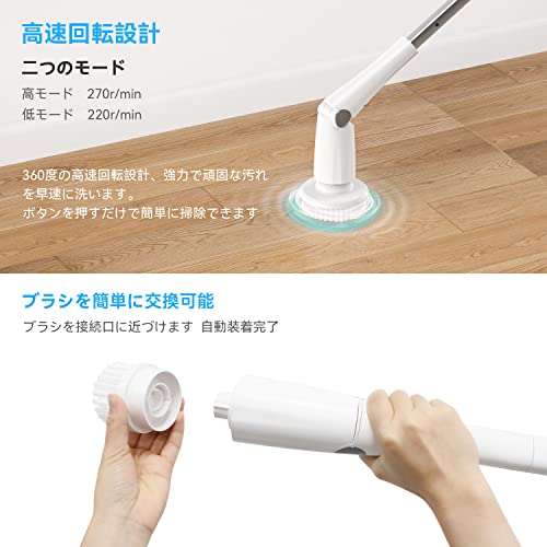 【二つの回転モード&静音設計】この電動掃除ブラシは二つのモードを搭載します。低モードの回転速度220-230r/min高モードの回転速度260-270r/min、低騒音モデルを設計ターボプロの運転音は70 dBです.電動バスポリッシャーの回転スピードは高速で力を入れずに汚れを徹底的に拭き取ります.