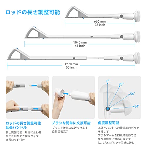 【延長レバー&角度調節可能】ブラシヘッド角度調節可能、回転角84°はです.3段設計により、実際の清掃距離によって、長さを