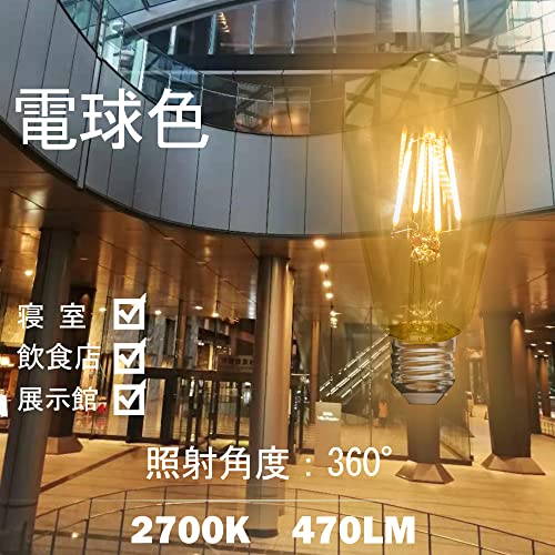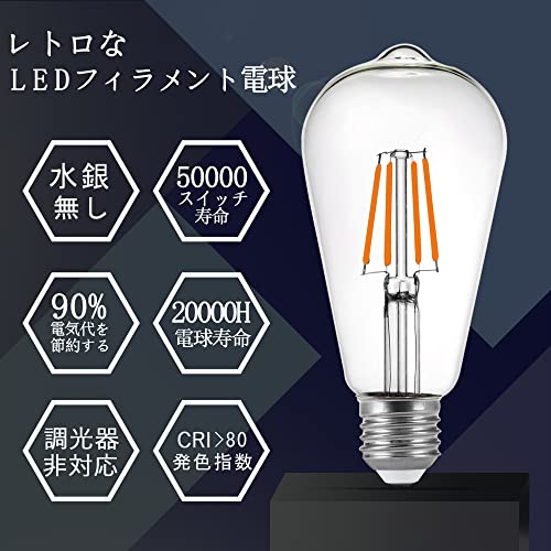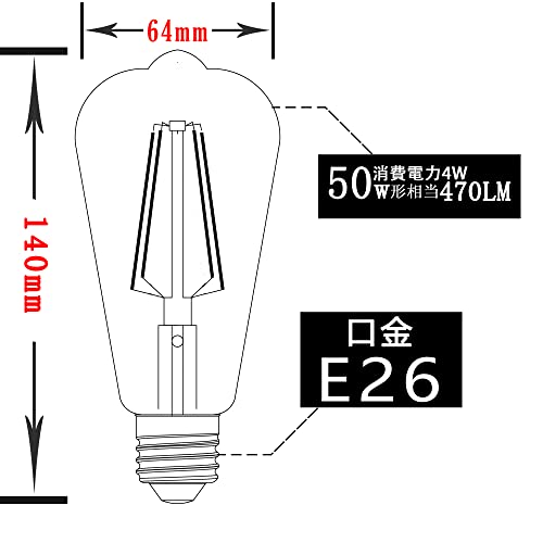 | 商品名 | LEDエジソン電球 フィラメント電球、ST64、4W、復古電球、透明なガラス、E26口金、2700K電球色、調光器には適し |