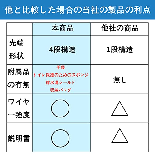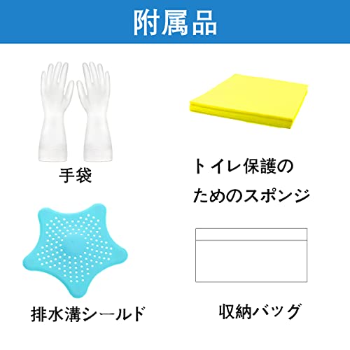 [充実した付属品]手袋、スポンジ、収納バッグ、排水溝シールドが付属しています。手袋は手の保護、スポンジはトイレの保護、収納バッグは商品を保管するときにお使いください。排水溝シールドは詰まりを未然に防ぐためにお使いいただけます。