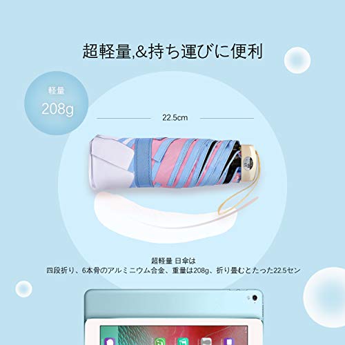 【超軽量・便利】 この超軽量 日傘は四段折り、6本骨のアルミニウム合金、重量は208g、折り畳むとたった22.5センチで収納ケースも付いてあるのでかばんに常備しておき、手荷物がある時でもスマートに対応。