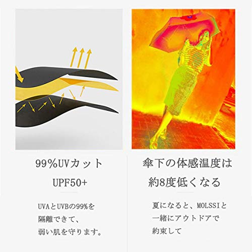 ?【晴雨兼用】 「紫外線防止&肌守り」裏面は特別な黒い遮熱コーディング加工で、普通の傘がUPF30+ぐらいですが、MOLSSI 折りたたみ傘の「UPF50+ UVカット率99%」以上となり、 晴れの日には有害な紫外線からお肌を守り、日焼けを防ぎます。炎天下でも安心に出かけることができます。 「超撥水加工」表面はテフロンポリエステル100%生地で日傘として使えるにとど