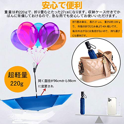 新昇級版(軽量&頑丈&大サイズ) 改善点1:自動折りたたみ傘は超軽量で頑丈な航空アルミ合金を採用、改善点2:傘の重量は約220g、自動開閉折りたたみ傘(通常350-450g以上 )は重いというイメージをお持ちの方は、ぜひお試しください。改善点3:開く直径が96cmから98cmに変更され。大きいサイズなので豪雨にも余裕で耐えられます吸水カバーも付いていて、カバンに常備しておけるので、急な雨でも安心