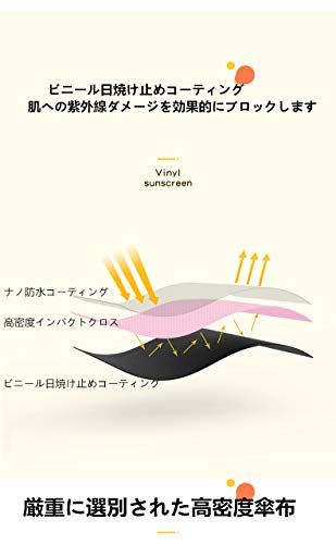 【UVカット・日傘】光を通り抜けな傘布を採用し、傘の内側に黒いコーティングが施されたため、UVカット率99.99%に達し、日焼け止め効果と遮光機能に優れています。真夏の外出でも熱中症を防ぐことができますので、大事なお肌を紫外線から守ります。
