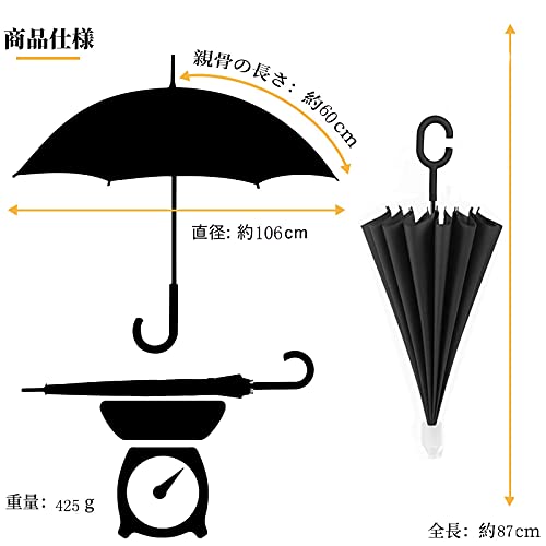 【傘仕樣】ストレート:長さ:87cm、展開直径:106cm、天蓋弧長:130cm、重量:600g、 骨の数:16本骨、傘骨:グラスファイバー