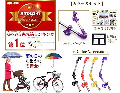 【本体カラー】:パープル、【付属品】:取付説明書(1枚)+スポンジ(2個)+両面テープ(2枚) 、【高さ調節】25-50cmの幅で傘の高さ調節可能、【ハンドル取付部の適応範囲】2.0 - 2.5cmのハンドルに適応(ご購入前にハンドルの厚さをご確認ください)、【傘固定部】傘の柄(通常のビニール傘であれば約1cm)を挟んで固定して使用して下さい。傘の持ち手部は太いため固定できません。【ネジの締め具合】強く押した時に本体が若干動く程度が望ましいです。若干動くことで風の勢いを吸収し、傘や本体が破損することを緩和しています。完全に固定することを目的とした仕様ではなく傘差し運転のサポートとコンパクトに折りたためる機能性を重視した作りとなっています。しっかりとした固定を