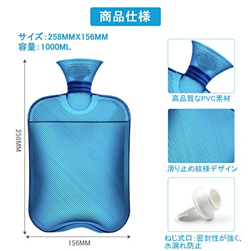 ?【商品仕様】サイズ:25.8cm15.6cm4.6cm;容量:1000ml、重さ:195g。耐熱温度は120[度]、耐冷温度は-20[度]。ボトル本体は丈夫でしなやかなPVC素材を採用、温めたいところを優しくフィットします。冬の寒い夜、お腹や腰にあてると、体をじんわり温めてくれます。