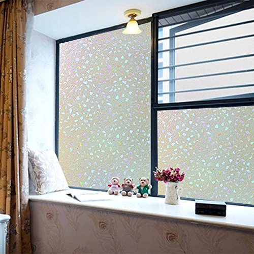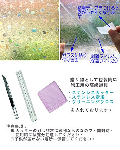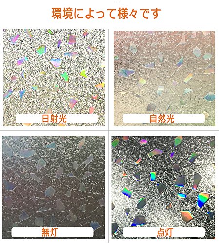 【目隠し、プライバシー保護】⇒ フィルムは元々透明なものですが、ガラスに貼れば光を屈折して半透明になって、虹色の艶を放します。光や使用環境によって、色や目隠し効果は少々異なります。光りが当たるとキラキラと虹色に輝きます。天然の日光が差し込む朝・昼も綺麗ですが、人工的なライトが映る夜も綺麗です。部屋のおしゃれな演出と目隠しの両立できます。外から室内が見えづらく、遠い目のプライバシーを保護します。外からの視線を遮りながら、かつ、充分に外の光を室内に取り込めます。カーテンを閉めているときの閉塞感や窮屈感あるの暗い部屋から解放されるでしょう。