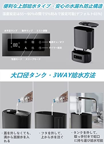 【知能恒湿システム・上部給水タイプ】6L大容量水タンク付、最大加湿量は約350ml/hとハイパワー!最大60時間連続加湿可能。知能恒湿システム搭載、センサーが湿度を感知して自動調節、湿度は55~90%の8段階で設定可能(5%刻み)。上部給水方式、噴出口下のグリル穴から水を注げます!