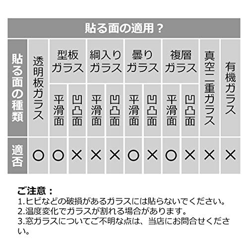 ?「対応ガラス」全ての滑らかな表面(凹凸がない)ガラスに適用です。木材、タイルやすりガラスなど粗い表面と多孔性表面のガラスに適用しません。